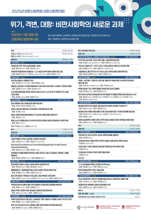 | 제목 | [공동학술대회] 2025년 비판사회학회 비판사회학대회 '위기, 격변, 대항: 비판사회학의 새로운 과제' |