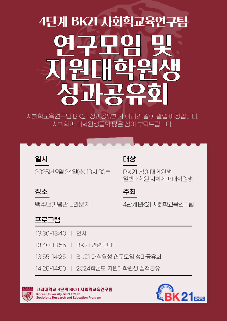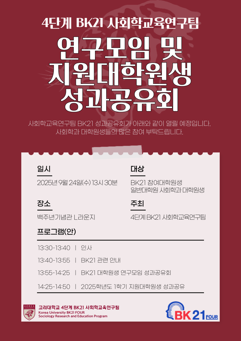 저번 학기와 마찬가지로 BK21 사회학교육연구팀의 연구모임 및 지원대학원생 성과발표회를 개최합니다. 참여대학원생의 자발적인 연구모임의 결과 및 연구장학금을 지원한 지원대학원생의 1학기 동안의 성과를 발표하는 자리오니 많은 참여 부탁드립니다. 일정 : 2025년 9월 24일(수) 13:30~14:50 장소 : 백주년기념관 1층 L라운지